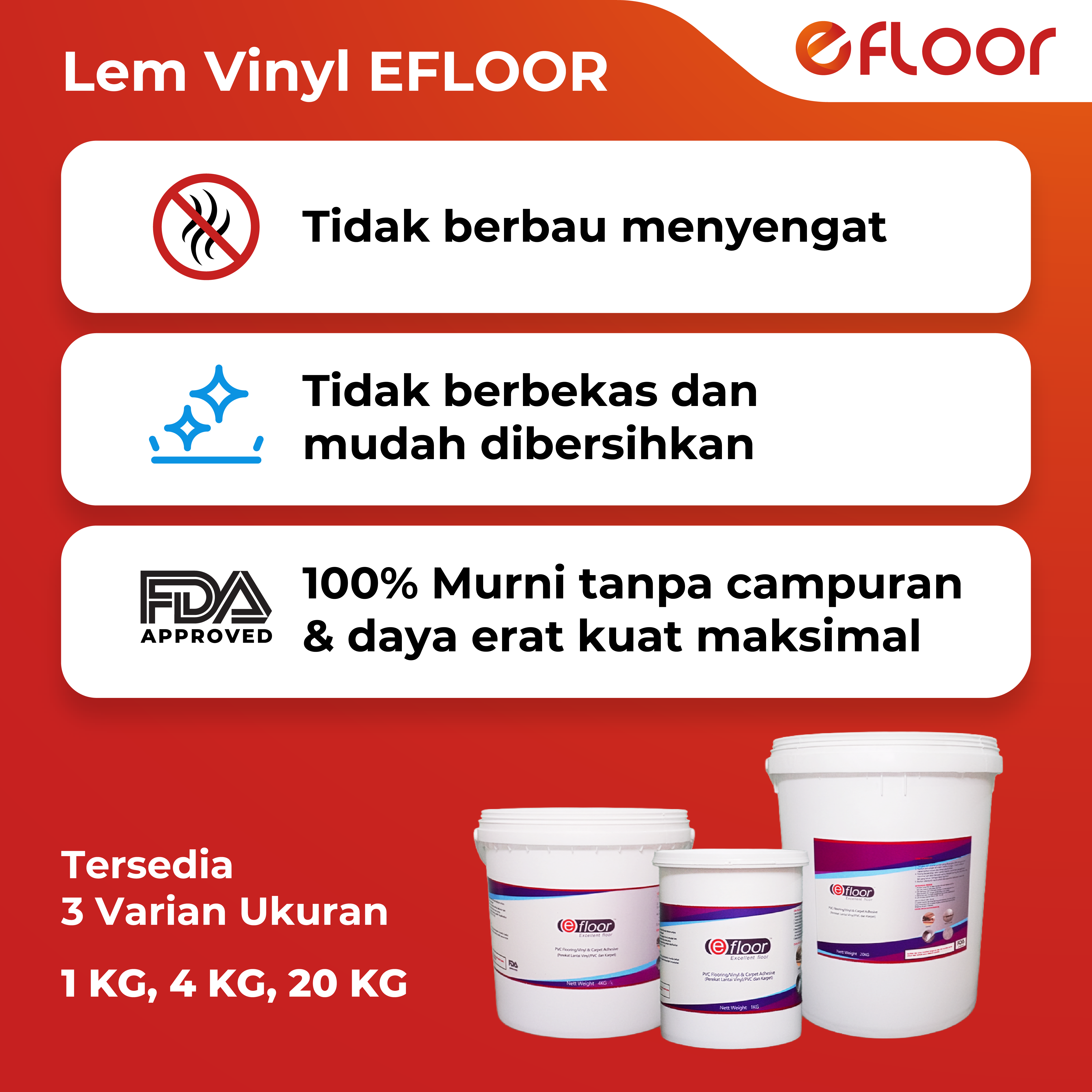 1) Apa keunggulan lem vinyl efloor? Lem efloor murni 100% dan tidak dicampur air, tidak berbau. Cukup oles satu sisi (lebih hemat) Jangkauan 8m2+ / 1KG, Isi lem dengan takaran berat (Kilogram), artinya apa yang dibeli customer akan pasti sesuai dengan isi nya.